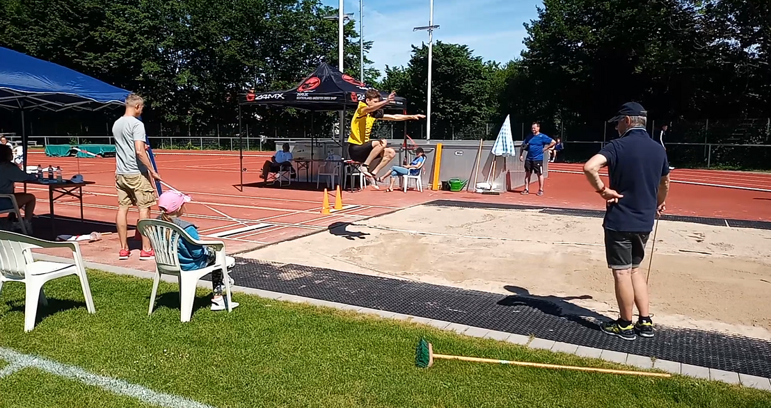 Los ging es für Florian und Konrad um 10.00 Uhr mit dem 100m-Lauf, in welchem sich die beiden ein enges Duell lieferten, wobei Florian um ein Haar schneller im Ziel war und sich über eine neue Besteistung von 13,04s freuen durfte. Konrad rannte ebenfalls eine neue Bestzeit und kam minimal später nach 13,06s ins Ziel. Als zweite Disziplin folgte der Weitsprung, bei welchem sich Konrad bei etwas zu starkem Wind von +4,8 m/s auf eine neue Bestleistung von 5,27m katapultieren konnte. Florian konnte sich nach seiner tollen 100m-Zeit auch im Weitsprung über eine neue Bestleistung von 4,63m freuen. Nach einer kurzen Ess- und Trinkpause ging es mit dem Kugelstoßen weiter. Auch hier konnte Florian mit der 5kg schweren Kugel seine Bestleistung auf 7,34m steigern und Konrad stoß zum ersten Mal im Wettkampf und erreichte 9,15m.
